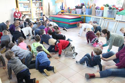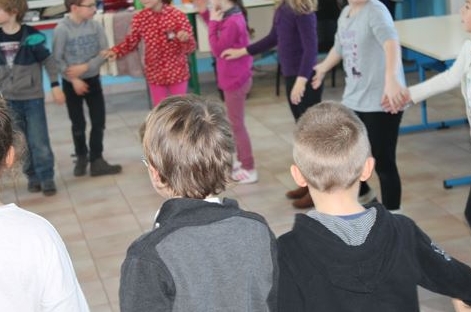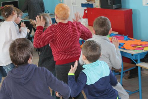 Le premier rendez-vous se fait le 5 février, pendant le temps scolaire. Nous demandons aux enfants de nous raconter leur histoire. Les deux classes se réunissent dans la salle de motricité et nous proposons d'explorer en mouvement et en musique l'histoire qu'ils ont écrite. Au cours de cette rencontre nous avons abordé la notion d'écoute des autres. Plusieurs principes de jeu sont trouvés : marcher à pas de loup, chanter en imitant le hurlement du loup avec variation d'intensité et de hauteur, danser comme une sorcière. Puis nous avons chorégraphié une danse de fête finale.